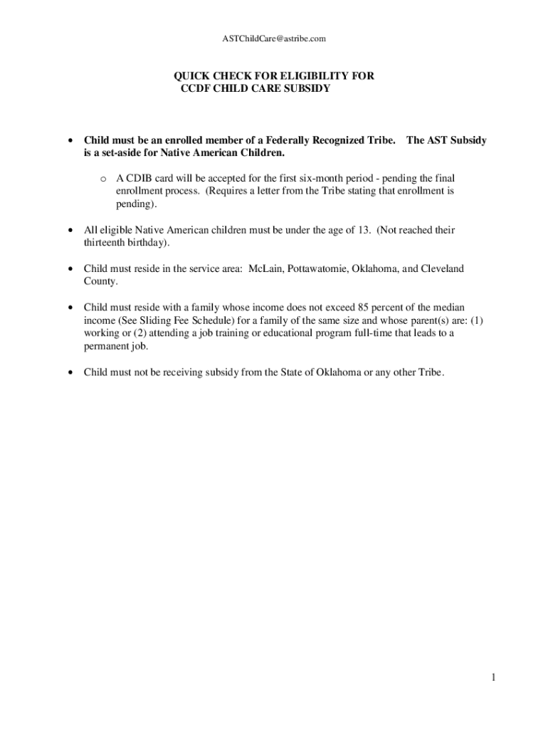 ASTChildCare@astribe.comQUICK CHECK FOR ELIGIBILITY FOR CCD CHILD CARE SUBSIDYChild must be an enrolled member of a Federally Recognized Tribe. Is a seaside for Native American Children. The AST Subsidy