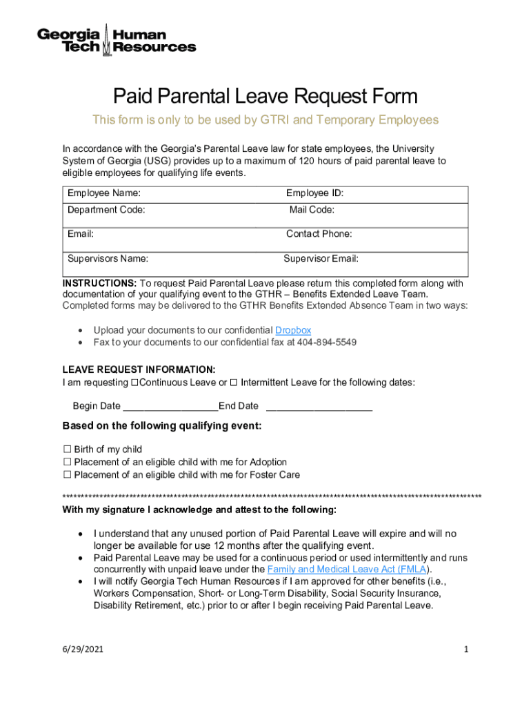 Paid Parental Leave Request Form This form is only to be used by GRI and Temporary Employees In accordance with the Georgia's Parental Leave law for state employees, the University System of Georgia