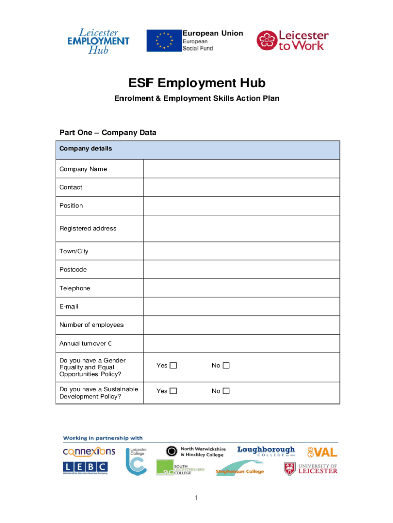 ESF Employment Hub Enrollment & Employment Skills Action Planar One Company Data Company details Company Name Contact PositionRegistered addressTown/City Postcode Telephone Email Number of employees