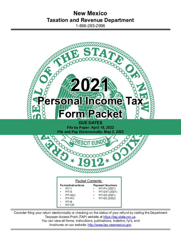 New MexicoTaxation and Revenue Department 186628529962021Personal Income Tax Form Packet DUE Dateline by Paper: April 18, 2022, File and Pay Electronically: May 2, 2022Packet Contents:Forms/Instructions
