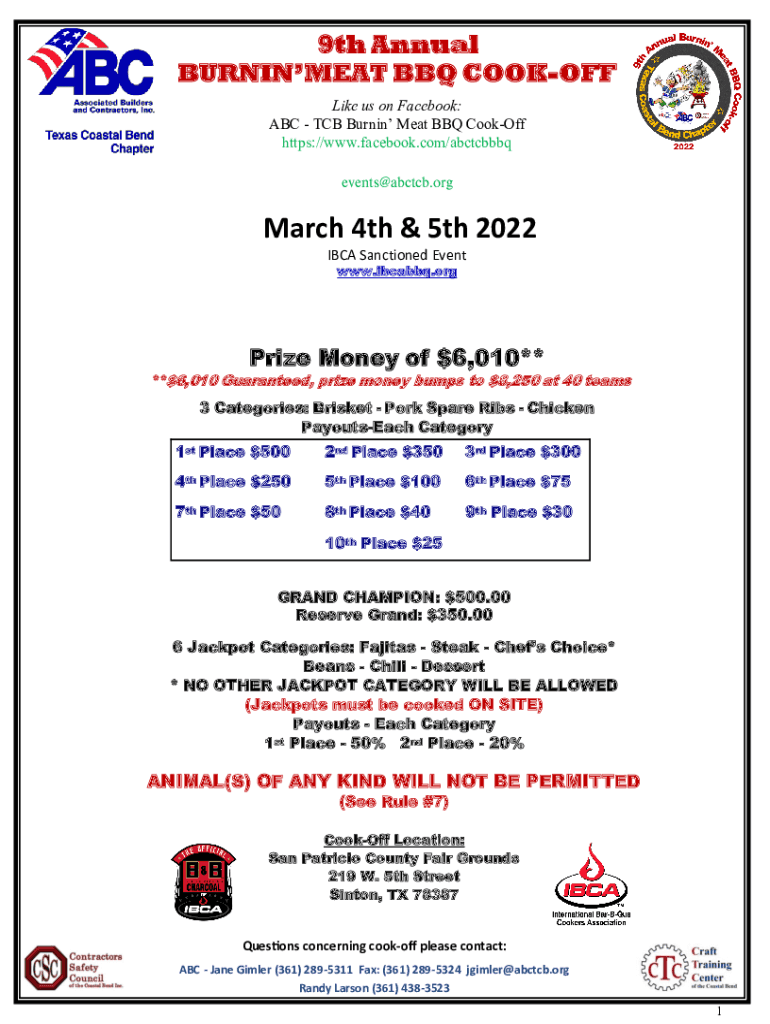 9th Annual BURNING MEAT BBQ COOKOUT Like us on Facebook: ABC PCB Burning Meat BBQ Cookout https://www.facebook.com/abctcbbbq events@abctcb.orgMarch 4th & 5th 2022 INCA Sanctioned Event www.ibcabbq.orgPrize