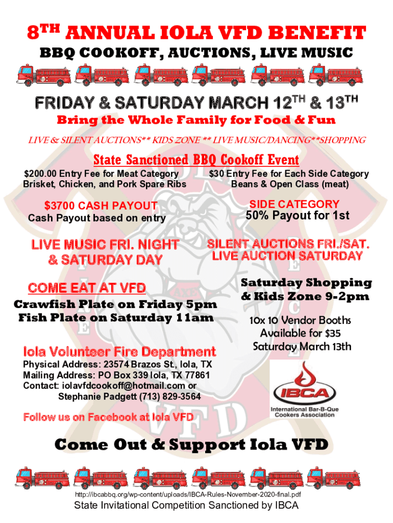 8TH ANNUAL IOWA FD BENEFIT BBQ COOKOUT, AUCTIONS, LIVE MUSICFRIDAY & SATURDAY, MARCH 12TH & 13TH Bring the Whole Family for Food & Fun LIVE & SILENT AUCTIONS** KIDS ZONE ** LIVE MUSIC/DANCING**SHOPPINGState