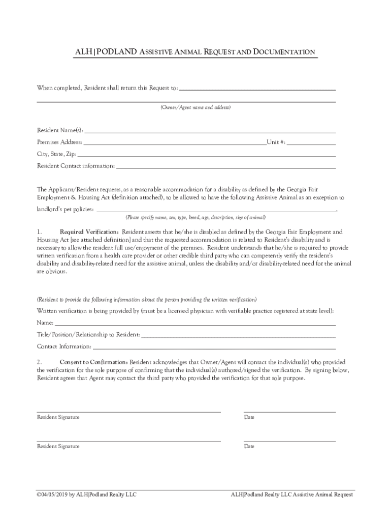 ALH|POLAND ASSISTIVE ANIMAL REQUEST AND DOCUMENTATIONWhen completed, Resident shall return this Request to: (Owner/Agent name and address)Resident Name(s): Premises Address:Unit #:City, State, Zip: