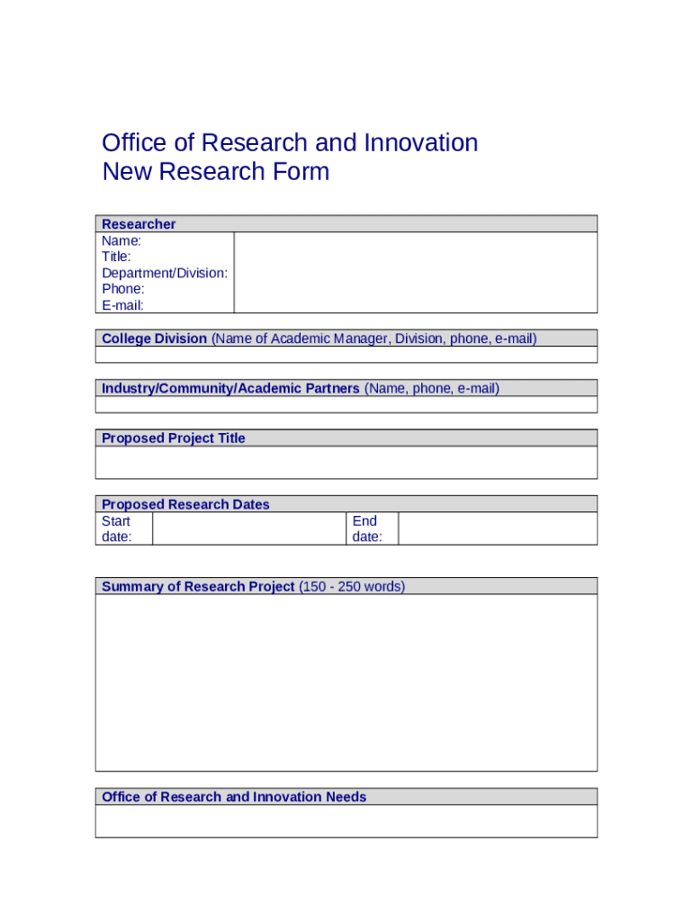 The New Research . <p>Office of Research and Innovation New Research Researcher Name is a Word document that can be completed and signed for specific purpose. In that case, it is furnished to the actual addressee to provide certain information of certain kinds. The completion and signing can be done manually or via a suitable application like PDFfiller. Such applications help to send in any PDF or Word file without printing them out. It also allows you to customize it depending on your needs and put an official legal digital signature. Once finished, the user sends the New Research . <p>Office of Research and Innovation New Research Researcher Name to the recipient or several recipients by mail and even fax. PDFfiller offers a feature and options that make your Word template printable. It includes a variety of settings when printing out appearance. It doesn't matter how you will file a form - in hard copy or by email - it will always look neat and firm. In order not to create a new editable template from scratch all the time, turn the original document into a template. Later, you will have a customizable sample.