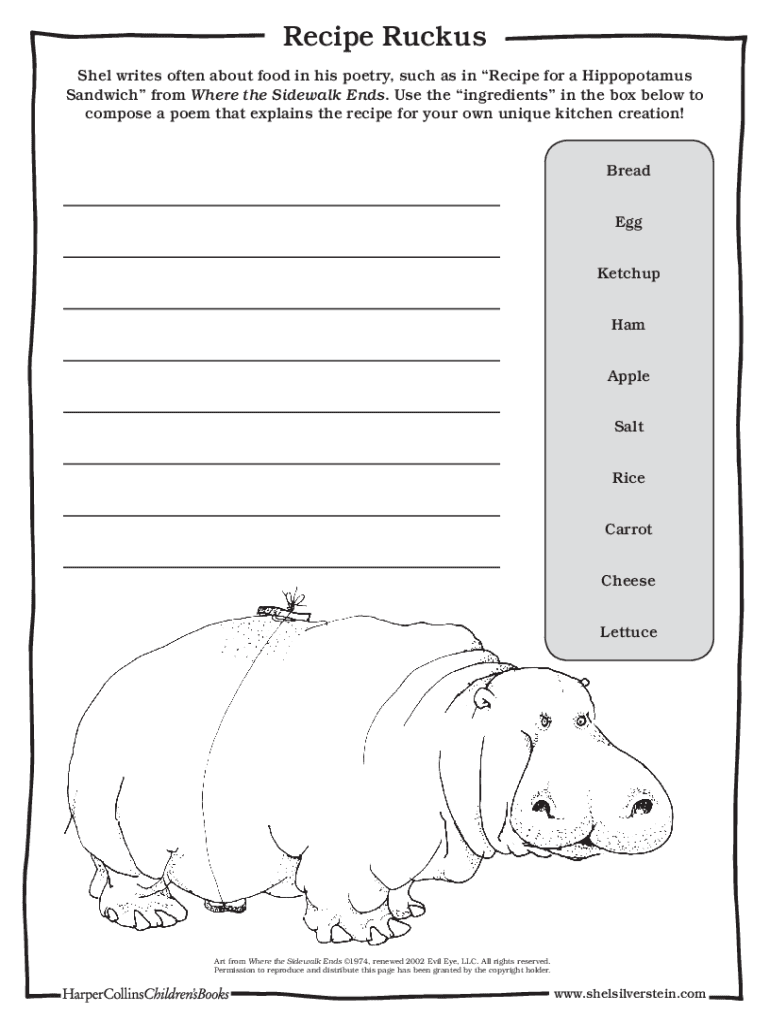 Recipe Ruckus She often writes about food in his poetry, such as in Recipe for a Hippopotamus Sandwich from Where the Sidewalk Ends. Use the ingredients in the box below to compose a poem that explains