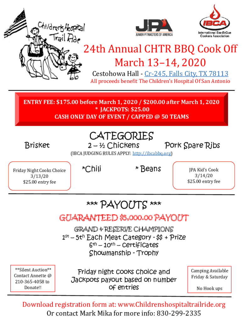 24th Annual CHAR BBQ Cook Off March 1314, 2020 Cestohowa Hall Cr245, Falls City, TX 78113 All proceeds benefit The Children's Hospital Of San AntonioENTRY FEE: $175.00 before March 1, 2020 / $200.00