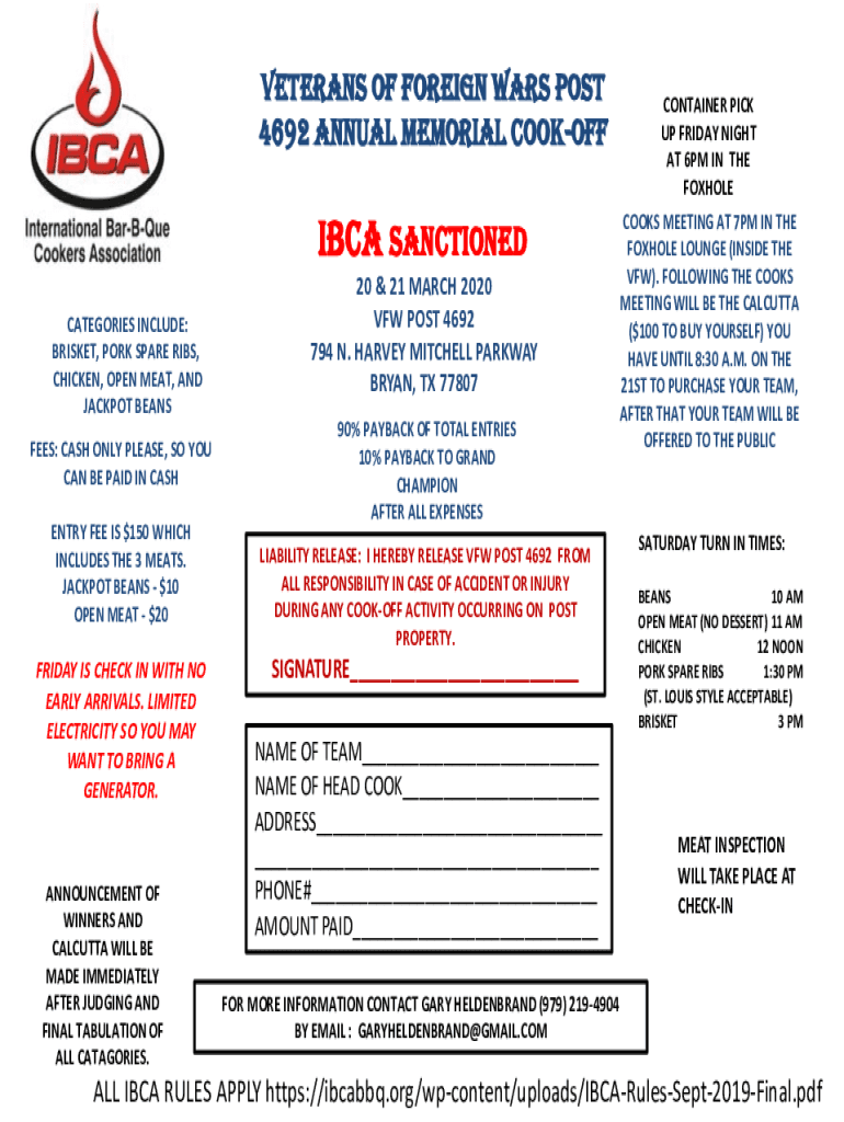 VETERANS OF FOREIGN WARS POST 4692 Annual MEMORIAL COOKOFFIBCA SANCTIONED CATEGORIES INCLUDE: BRISKET, PORK SPARE RIBS, CHICKEN, OPEN MEAT, AND JACKPOT BEANS FEES: CASH ONLY PLEASE, SO YOU CAN BE