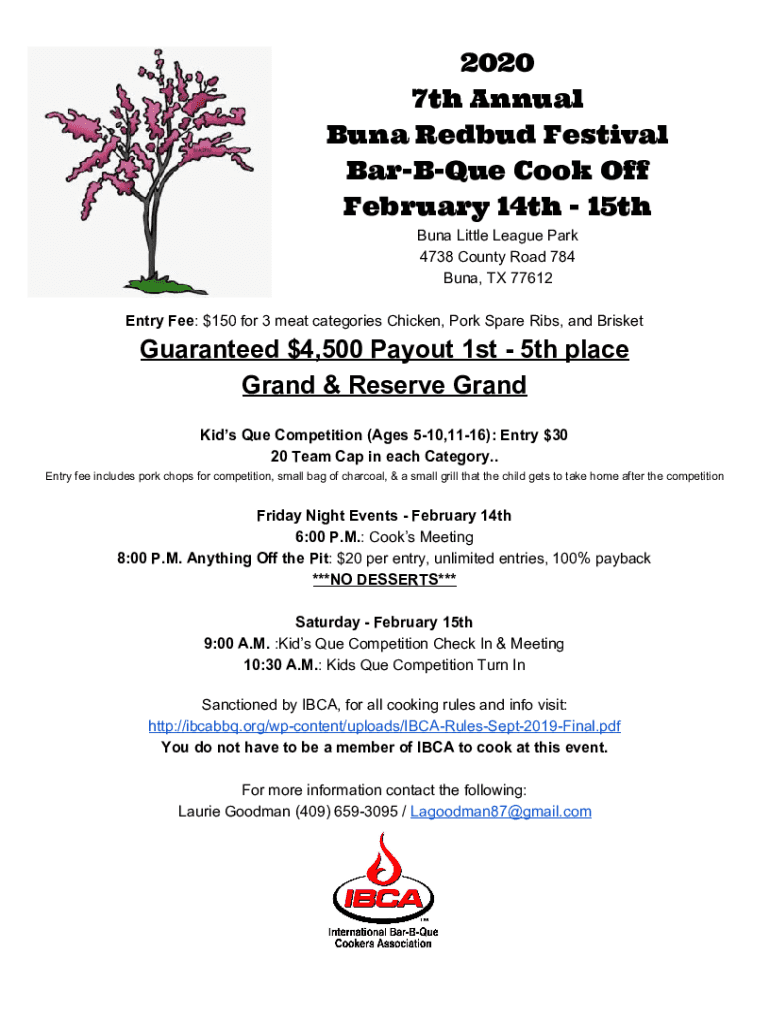 2020 7th Annual Luna Redbud Festival Baroque Cook Off February 14th 15th Luna Little League Park 4738 County Road 784 Luna, TX 77612 Entry Fee: $150 for 3 meat categories Chicken, Pork Spare Ribs,