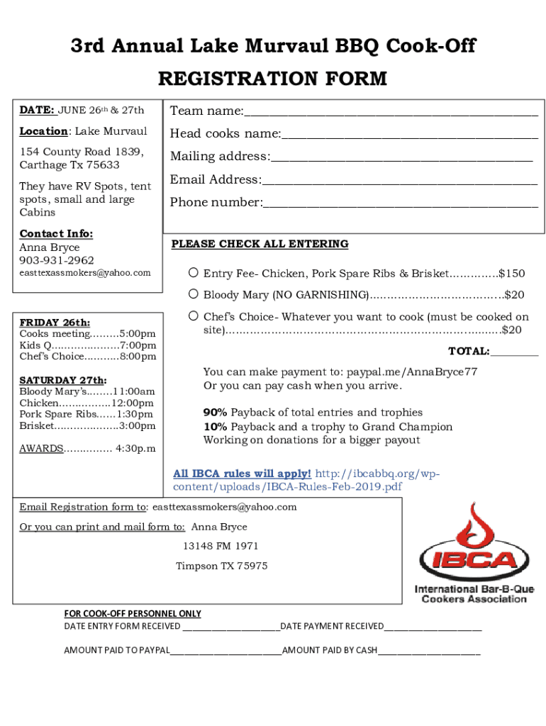Get the free 3rd Annual Lake Murvaul BBQ Cook-Off REGISTRATION FORM