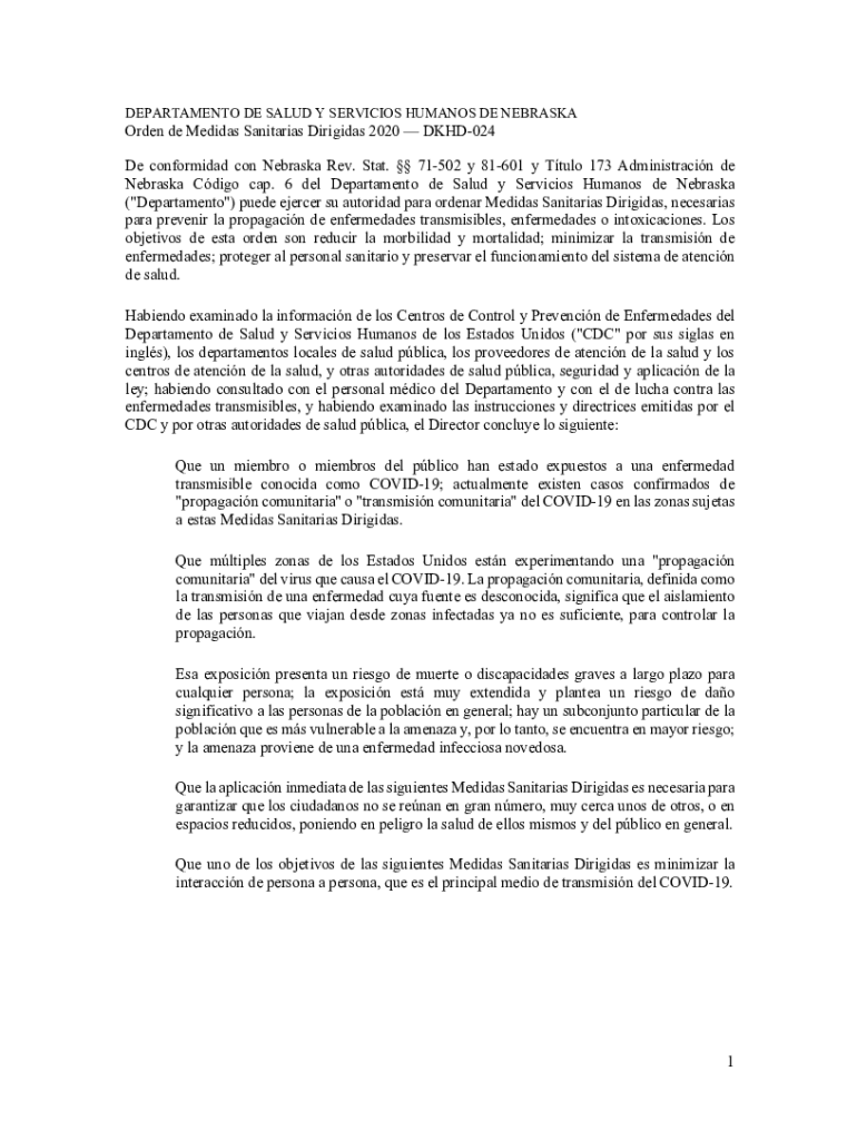 DEPARTMENT DE SALAD Y SERVICES HUMANS DE NEBRASKAOrden de Medidas Sanitarian Dirigible 2020 DKHD024De conforming con Nebraska Rev. Stat. 71502 y 81601 y Truly 173 Administration de Nebraska Cargo