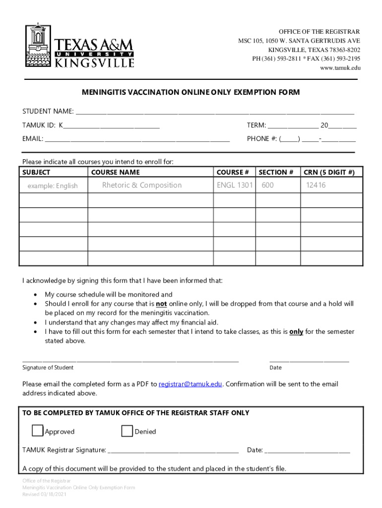 OFFICE OF THE REGISTRAR MSC 105, 1050 W. SANTA GERTRUDE AVE HINESVILLE, TEXAS 783638202 PH (361) 5932811 * FAX (361) 5932195 www.tamuk.eduMENINGITIS VACCINATION ONLINE ONLY EXEMPTION FORM STUDENT