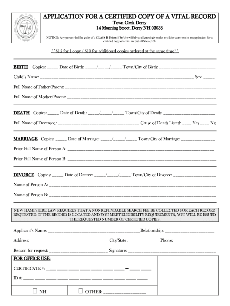 APPLICATION FOR A CERTIFIED COPY OF A VITAL RECORD Town Clerk Derry 14 Manning Street, Derry NH 03038 NOTICE: Any person shall be guilty of a CLASS B Felony if he/she willfully and knowingly make