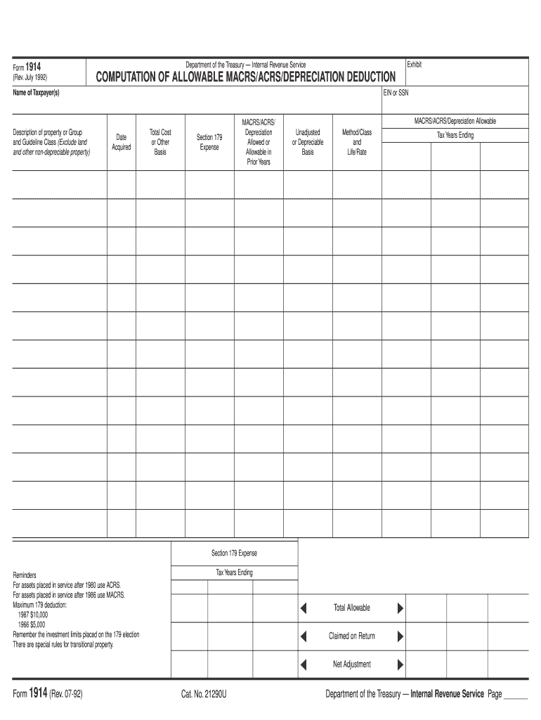 IRS Form 1914 serves to compute allowable MACRS and ACRS depreciation deductions on business property. This form is essential for both businesses and individual taxpayers seeking to accurately report their depreciation for tax purposes. The form has been in use since its revision in July 1992, reflecting updates relevant to tax years up to 1987.