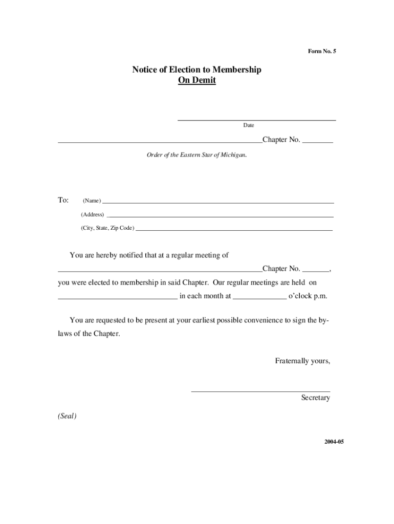 Form No. 5Notice of Election to Membership On Debit___ Date___Chapter No. ___ Order of the Eastern Star of Michigan. To:(Name) ___ (Address) ___ (City, State, Zip Code) ___You are hereby notified
