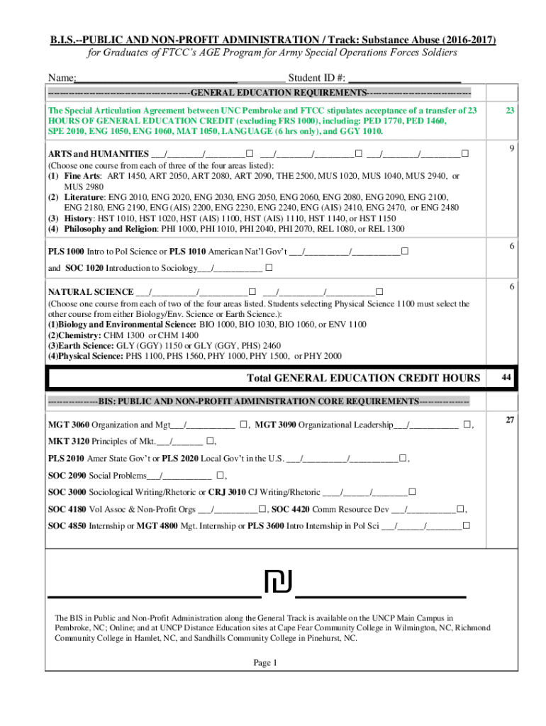 B.I.S.PUBLIC AND NONPROFIT ADMINISTRATION / Track: Substance Abuse (20162017) for Graduates of FTC Cs AGE Program for Army Special Operations Forces Soldiers Name:___ Student ID #:GENERAL EDUCATION