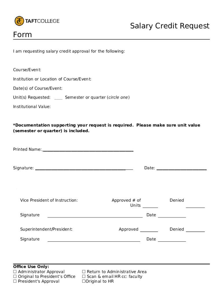 The I am requesting salary credit approval for the following: is a document which can be filled-out and signed for certain needs. In that case, it is furnished to the exact addressee in order to provide specific information of any kinds. The completion and signing is available in hard copy or using a suitable solution e. g. PDFfiller. Such services help to send in any PDF or Word file without printing them out. It also lets you customize its appearance according to your requirements and put legit digital signature. Upon finishing, the user ought to send the I am requesting salary credit approval for the following: to the respective recipient or several recipients by mail or fax. PDFfiller has a feature and options that make your Word template printable. It provides different options for printing out appearance. It doesn't matter how you will file a form after filling it out - physically or by email - it will always look neat and clear. In order not to create a new editable template from scratch all the time, make the original document as a template. Later, you will have a rewritable sample.