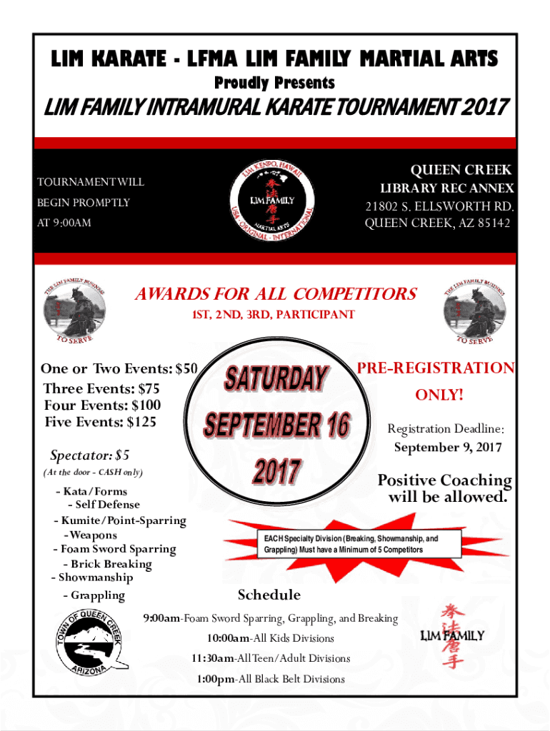 LIM KARATE LIMA LIM FAMILY MARTIAL ARTS Proudly Presents LIM FAMILY INTRAMURAL KARATE TOURNAMENT 2017 QUEEN CREEKTOURNAMENT WILLLIBRARY REC ANNEX 21802 S. ELLSWORTH RD. QUEEN CREEK, AZ 85142BEGIN