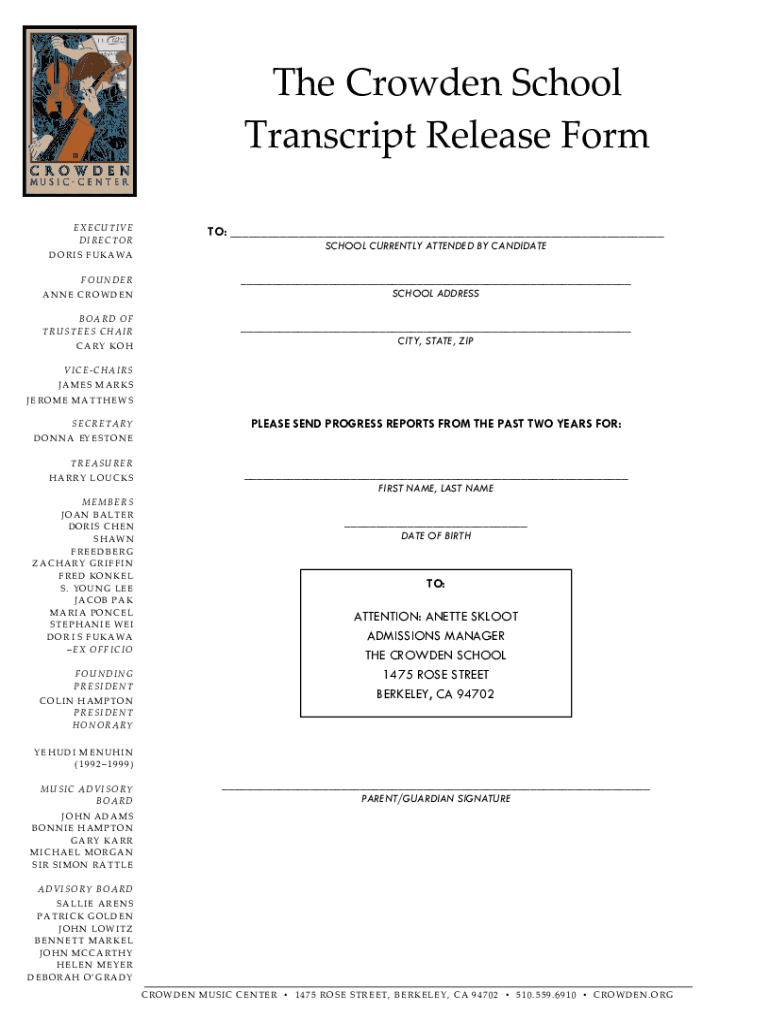 The Crowded School Transcript Release Form EXECUTIVE DIRECTOR DORIS OTTAWA FOUNDER TO: ___ SCHOOL CURRENTLY ATTENDED BY CANDIDATE___ANNE CROWDENSCHOOL PRESSBOARD OF TRUSTEES CHAIR___CARY CITY, STATE,