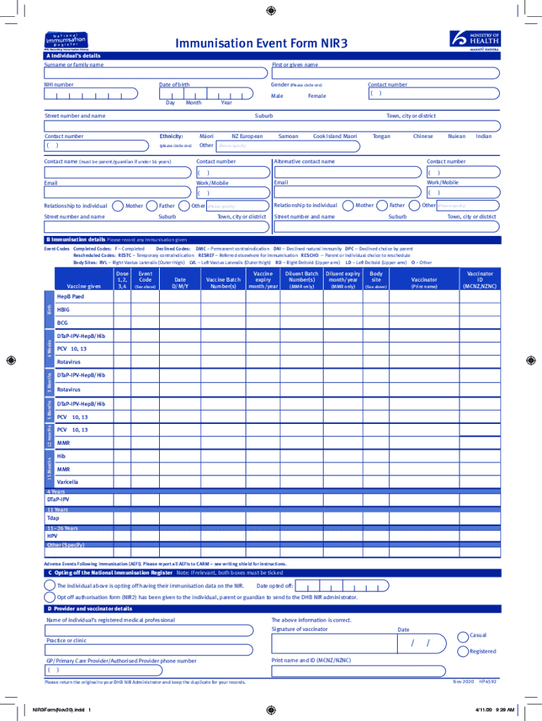 Immunisation event form NIR3 is a form used to report immunisation events to the National Immunisation Register (NIR).