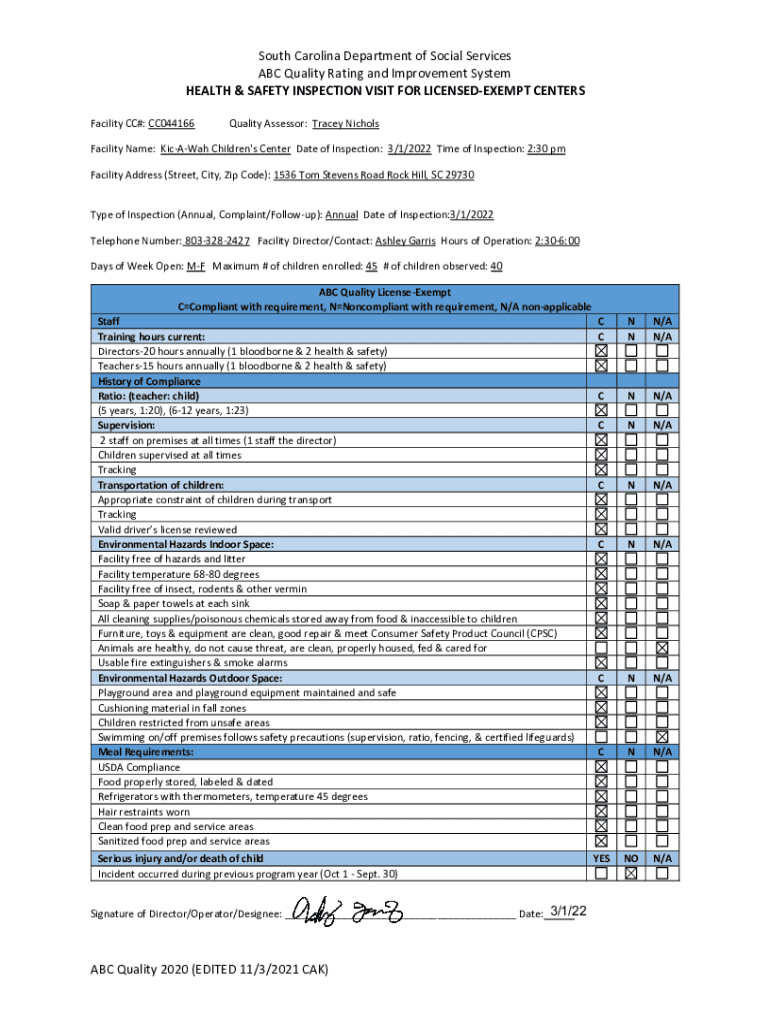 South Carolina Department of Social Services ABC Quality Rating and Improvement System HEALTH & SAFETY INSPECTION VISIT FOR LICENSEDEXEMPT CENTERS Facility CC#: CC044166Quality Assessor: Tracey NicholsFacility