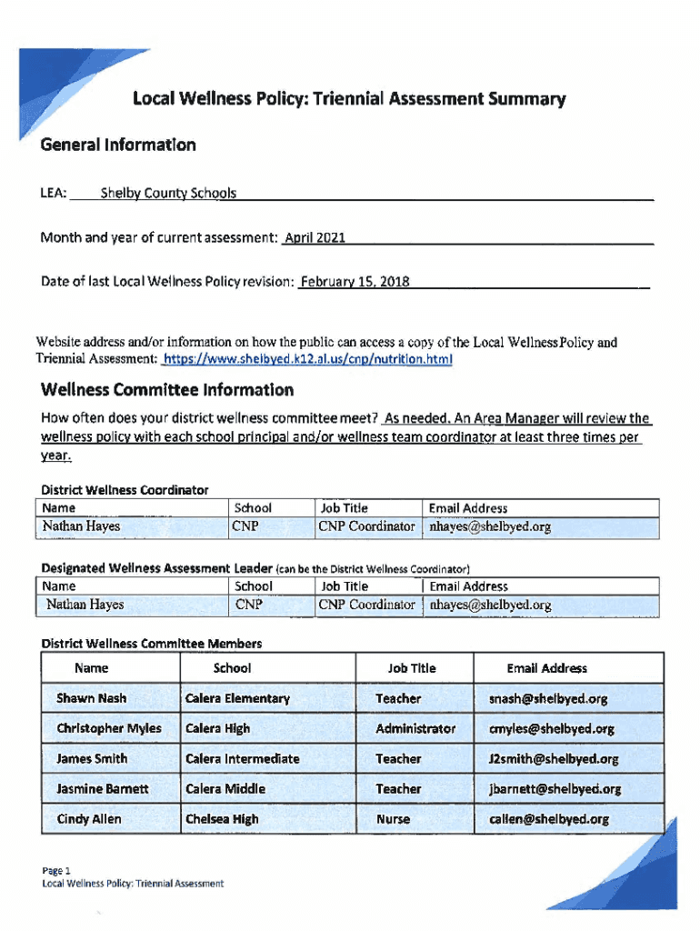 Local Wellness Policy: Triennial Assessment Summary General Information LEA: ___S___h___e___lb__, y._C___o.....u___n___t.... Y___S___ ch___o__o__ls_ ___Month and year of current assessment: __A\”\”\”p__r__
