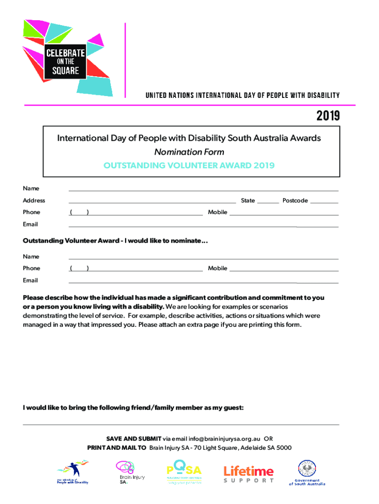 2019 International Day of People with Disability South Australia Awards Nomination Form OUTSTANDING VOLUNTEER AWARD 2019 As a part of our celebrations during International Day of People with Disability
