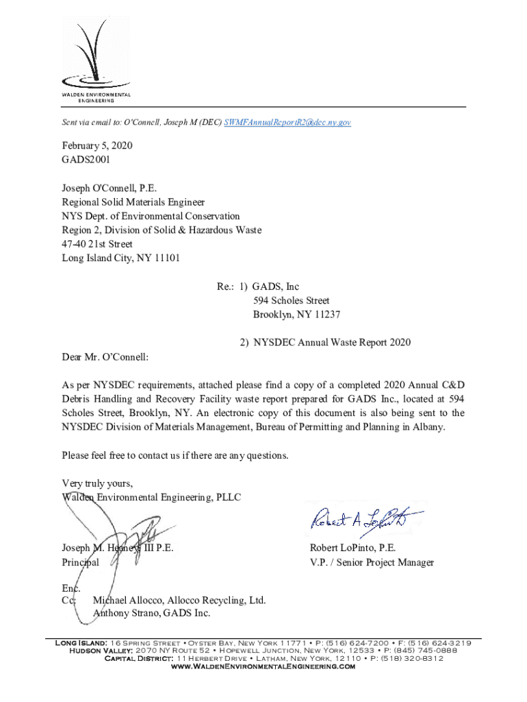 Sent via email to: O\'Connell, Joseph M (DEC) SWMFAnnualReportR2@dec.ny.govFebruary 5, 2020 GADS2001 Joseph O\'Connell, P.E. Regional Solid Materials Engineer NYS Dept. of Environmental Conservation
