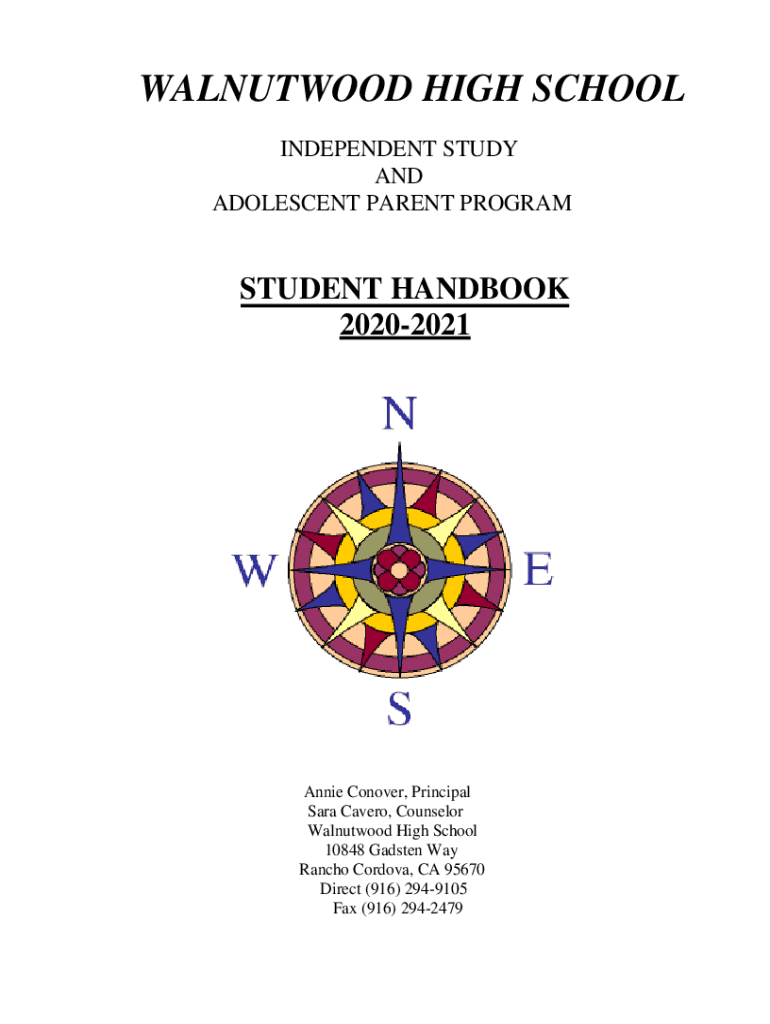 WALNUTWOOD HIGH SCHOOL INDEPENDENT STUDY AND ADOLESCENT PARENT PROGRAMSTUDENT HANDBOOK 20202021Annie Conover, Principal Sara Cavern, Counselor Walnut wood High School 10848 Gadsden Way Rancho Cordova,