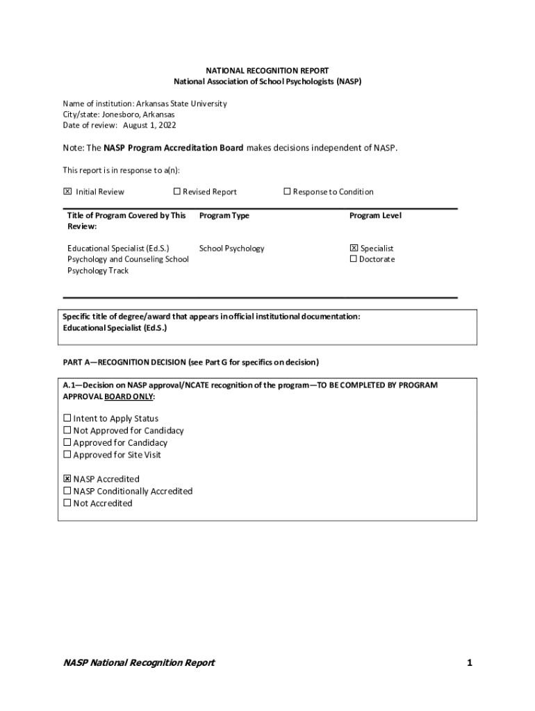 NATIONAL RECOGNITION REPORT National Association of School Psychologists (NASA) Name of institution: Arkansas State University City/state: Jonesboro, Arkansas Date of review: August 1, 2022Note: The