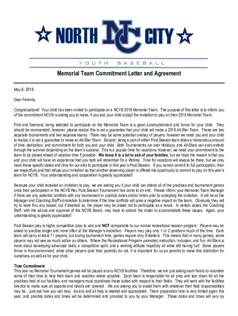 Memorial Team Commitment Letter and Agreement May 6, 2018, Dear Parents, Congratulations! Your child has been invited to participate on a NCB 2018 Memorial Team. The purpose of this letter is to inform