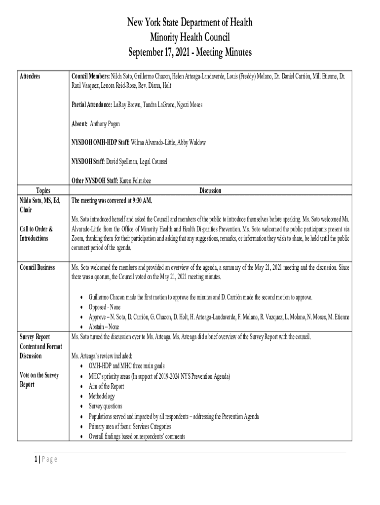 New York State Department of Health Minority Health Council September 17, 2021, Meeting Minutes AttendeesCouncil Members: Hilda Soto, Guillermo Charon, Helen ArteagaLandaverde, Louis (Freddy) Milano,