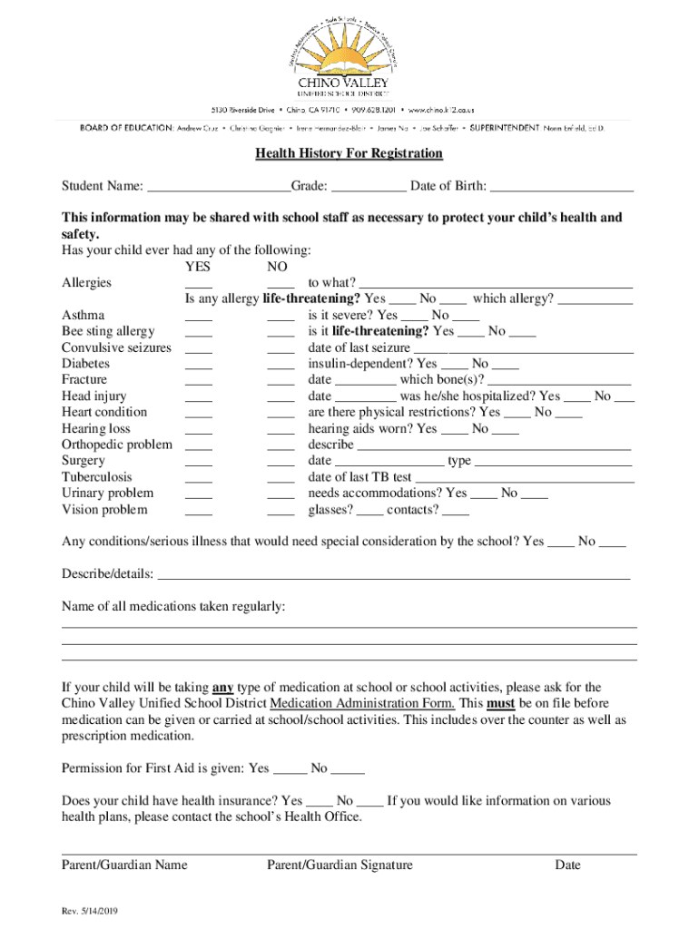 Get the free Health History For Registration safety. - Chino Valley Unified School ...