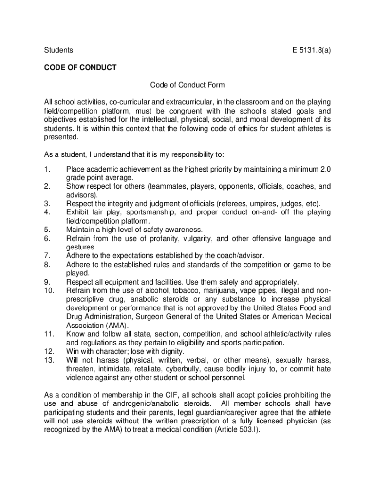 Students 5131.8(a)CODE OF CONDUCT Code of Conduct Form All school activities, cocurricular and extracurricular, in the classroom and on the playing field/competition platform, must be congruent with