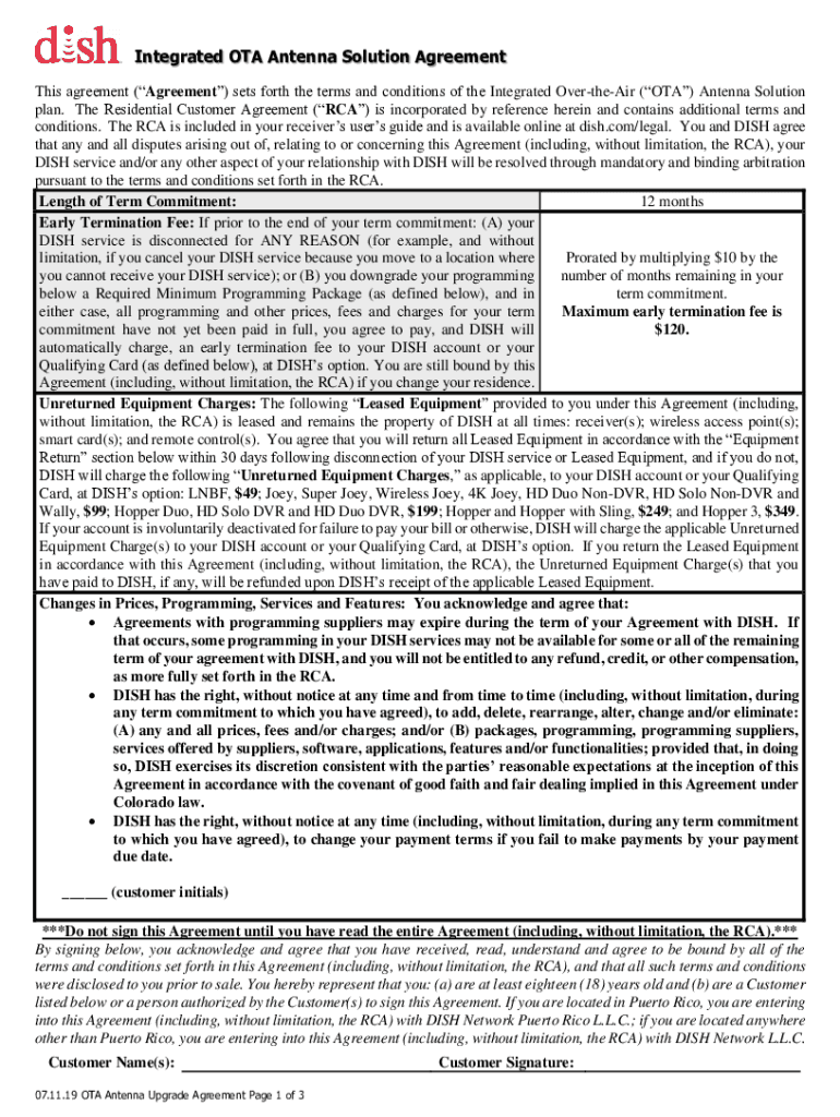 Integrated OTA Antenna Solution Agreement This agreement (Agreement) sets forth the terms and conditions of the Integrated Overhear (OTA) Antenna Solution plan. The Residential Customer Agreement