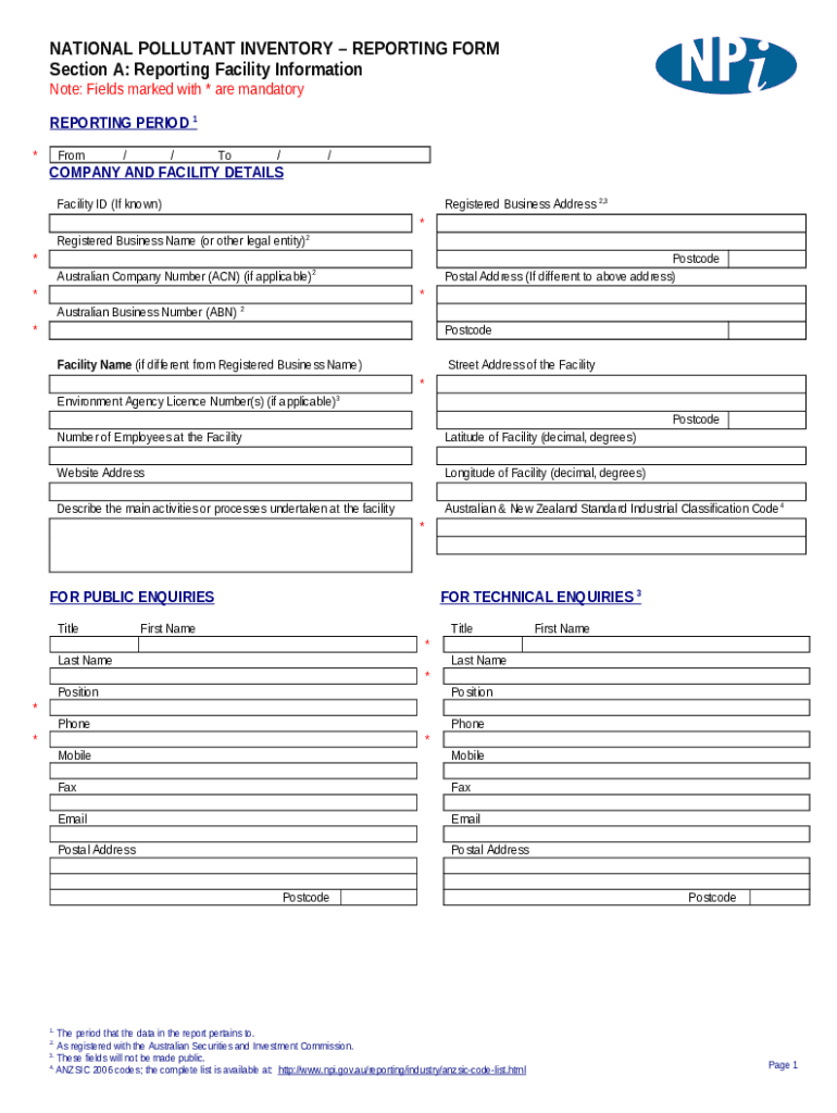 What is NATIONAL POLLUTANT INVENTORYREPORTING Section A: Reporting ... Form?