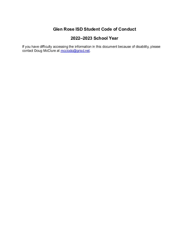 Glen Rose ISD Student Code of Conduct 20222023 School Year If you have difficulty accessing the information in this document because of disability, please contact Doug McClure at mcclodo@grisd.net.