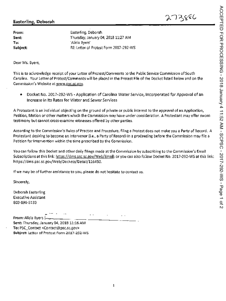 Ea sterling, Deborah Thursday, January 04, 2018 11:27 From: Sent: To:\'Alicia Byers\'E:Letter of Protest Form 2017292WSSubject:Dear Ms. Byers’t. This is to acknowledge receipt of your Letter of
