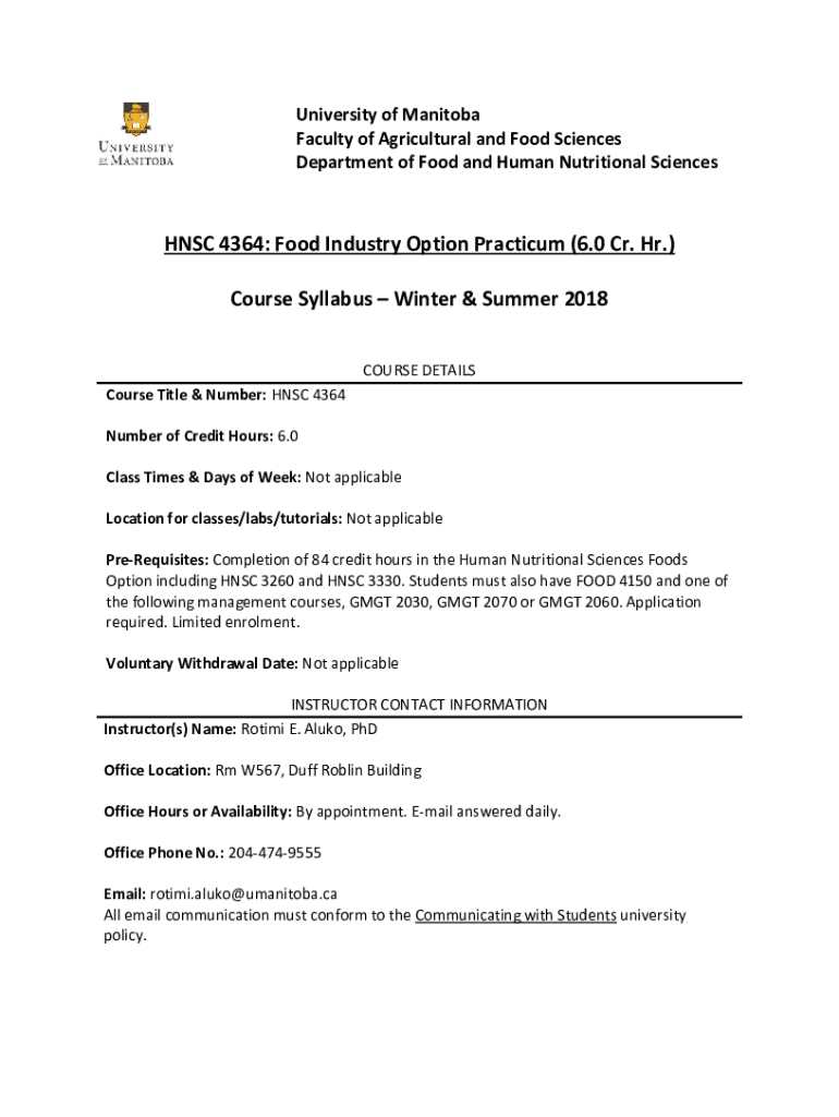 UniversityofManitoba FacultyofAgriculturalandFoodSciences DepartmentofFoodandHumanNutritionalSciences HNSC4364:FoodIndustryOptionPracticum(6.0Cr. Hr.) CourseSyllabusWinter&Summer2018 COURSEDETAILS