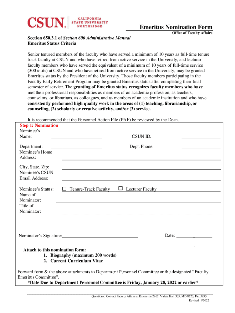 Emeritus Nomination Form Office of Faculty AffairsSection 650.3.1 of Section 600 Administrative Manual Emeritus Status Criteria Senior tenured members of the faculty who have served a minimum of 10