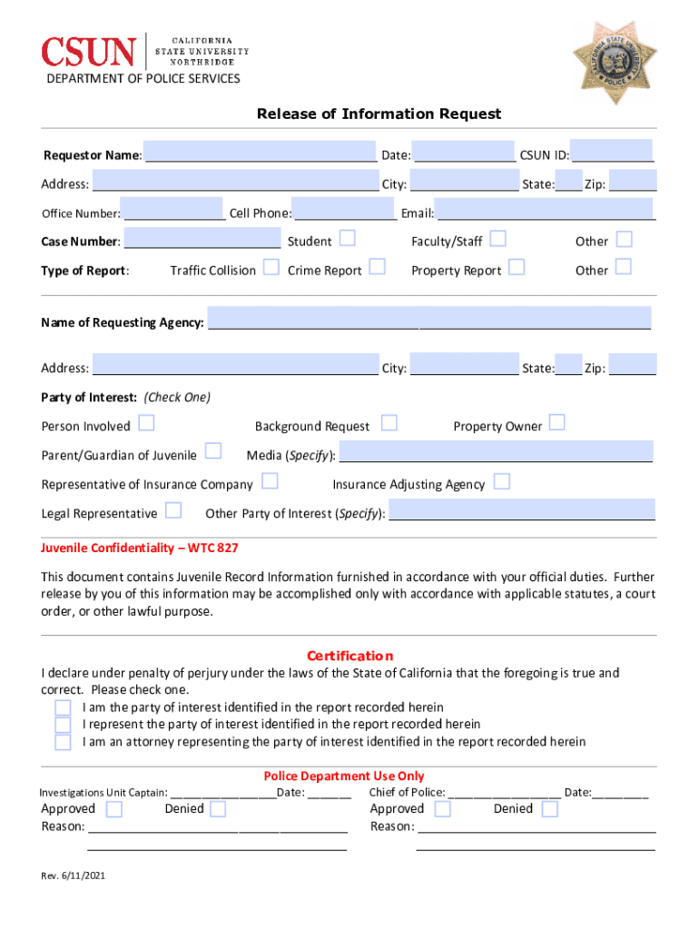 DEPARTMENT OF POLICE SERVICES Release of Information Request Requestor Name: ___ Date: ___ SUN ID: ___ Address: ___ City: ___ State:___ Zip: ___ Office Number: ___ Cell Phone: ___ Email: ___Case Number: