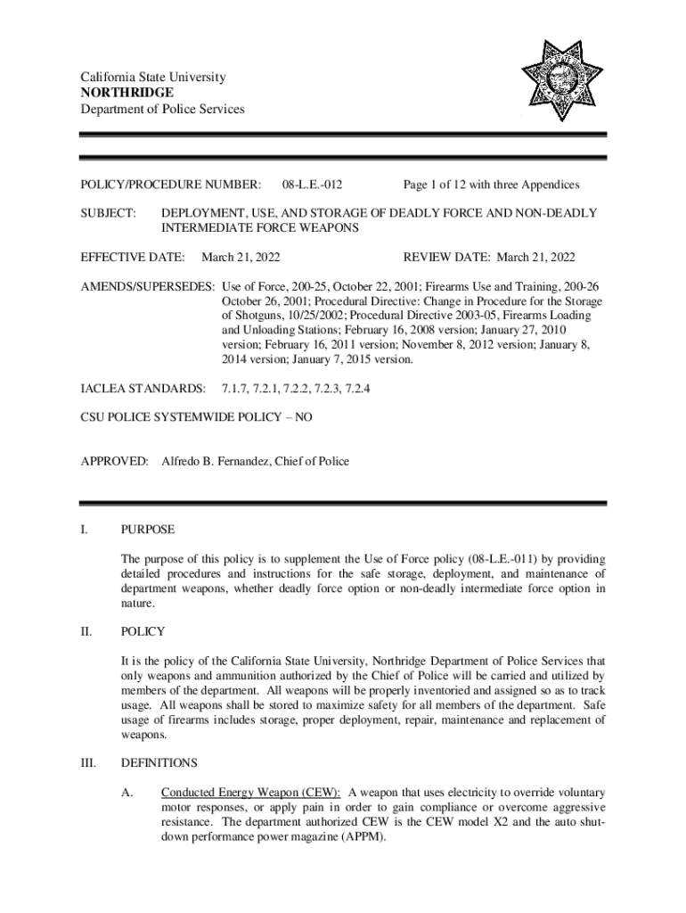 California State University NORTHRIDGE Department of Police ServicesPOLICY/PROCEDURE NUMBER: SUBJECT:08L. E.012Page 1 of 12 with three AppendicesDEPLOYMENT, USE, AND STORAGE OF DEADLY FORCE AND DEADLY