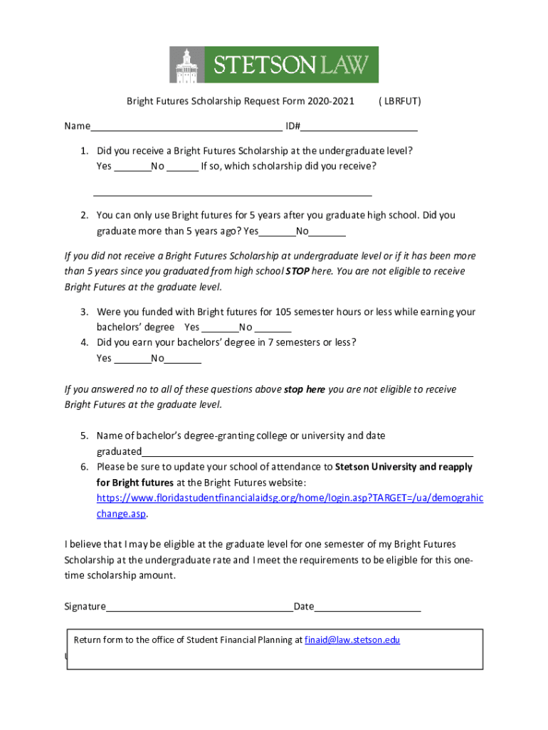 Bright Futures Scholarship Request Form 20202021(BRUT)Name___ ID#___ 1. Did you receive a Bright Futures Scholarship at the undergraduate level? Yes ___No ___ If so, which scholarship did you receive?