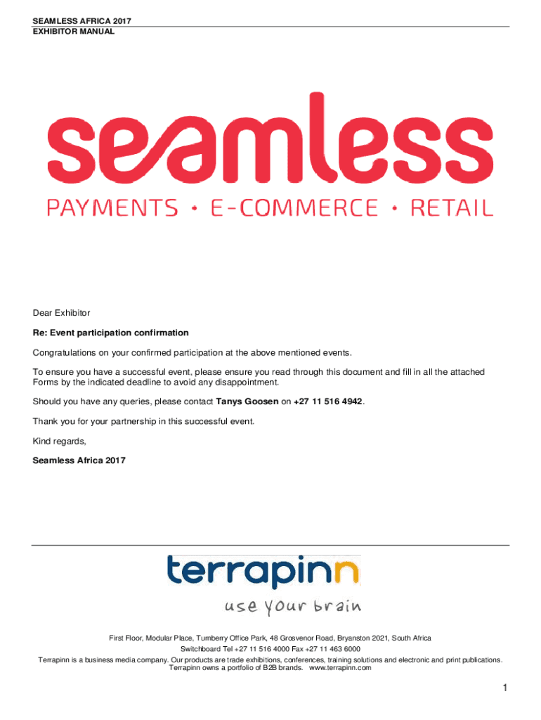 SEAMLESS AFRICA 2017 EXHIBITOR Manlier Exhibitor Re: Event participation confirmation Congratulations on your confirmed participation at the above-mentioned events. To ensure you have a successful