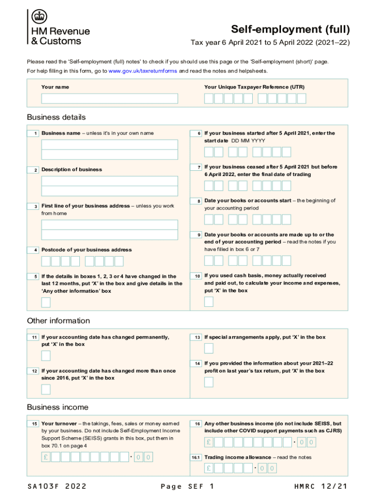 Self-employment (full) Tax year 6 April 2021 to 5 April 2022 (202122) Please read the Self employment (full) notes to check if you should use this page or the Self employment (short) page. For help