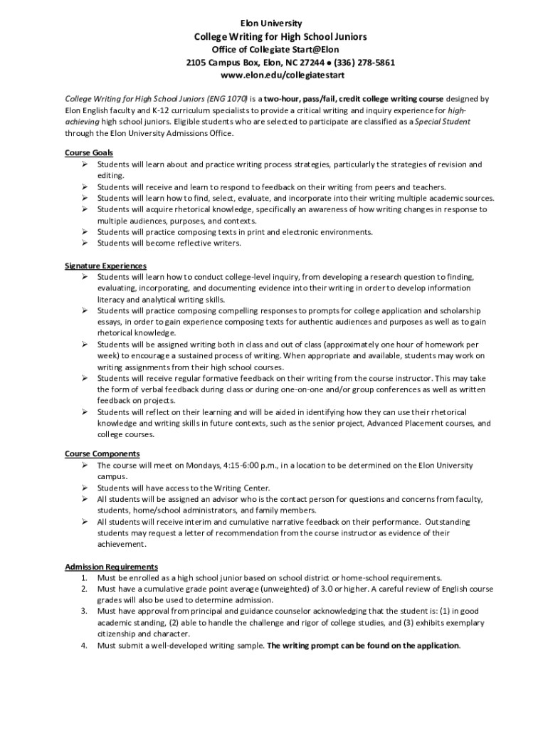 Elon UniversityCollege Writing for High School Juniors Office of Collegiate Start@Elon 2105 Campus Box, Elon, NC 27244 (336) 2785861 www.elon.edu/collegiatestart College Writing for High School Juniors