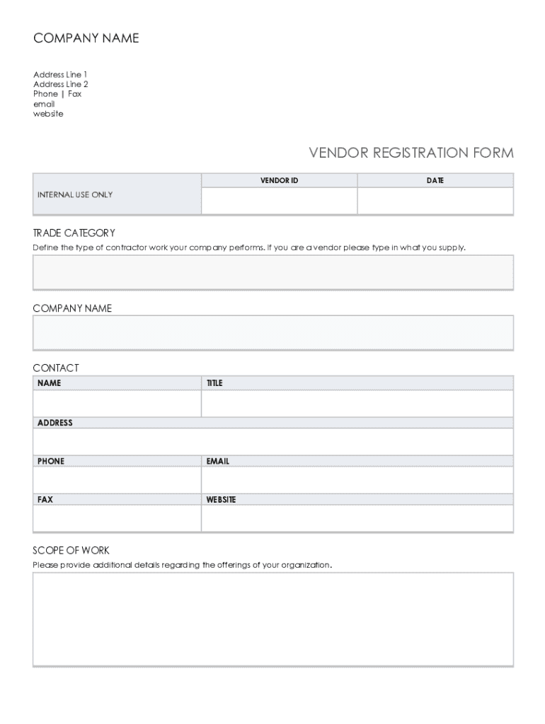 COMPANY NAME Address Line 1 Address Line 2 Phone | Fax email websiteVENDOR REGISTRATION FORM VENDOR IDDATEINTERNAL USE ONLYTRADE CATEGORY Define the type of contractor work your company performs.