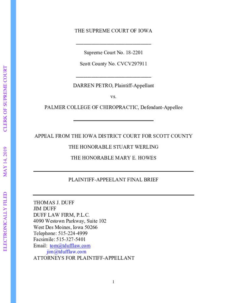 THE SUPREME COURT OF IOWA ___ Supreme Court No. 182201 CLERK OF SUPREME COURT Scott County No. CVCV297911 ___ DARREN METRO, PlaintiffAppellant vs. PALMER COLLEGE OF CHIROPRACTIC, DefendantAppelleeAPPEAL