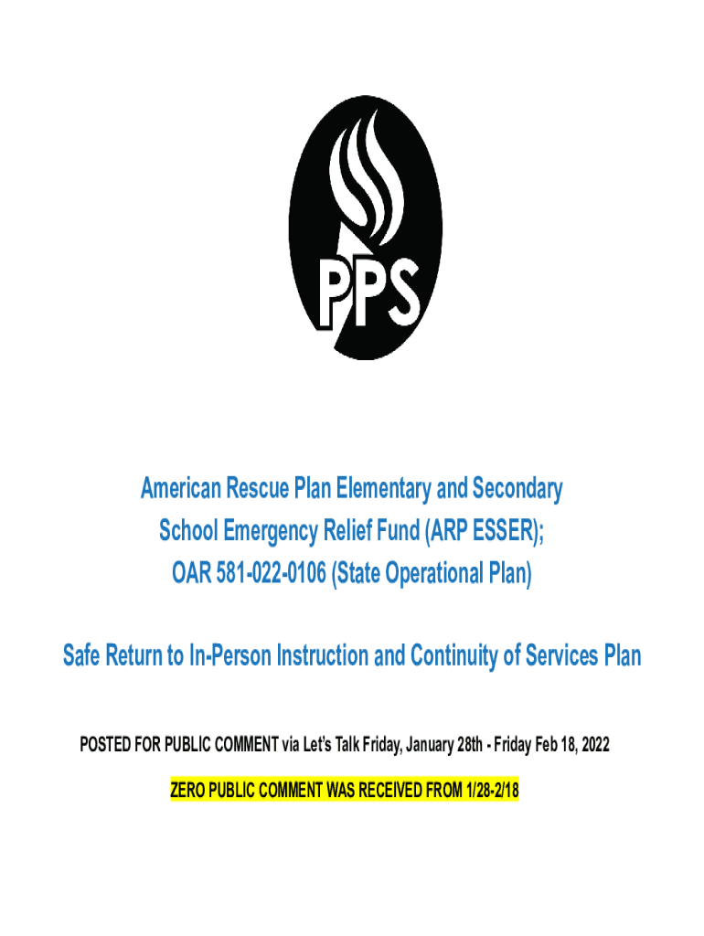 American Rescue Plan Elementary and Secondary School Emergency Relief Fund (ARP LESSER); OAR 5810220106 (State Operational Plan)Safe Return to Unperson Instruction and Continuity of Services Plan