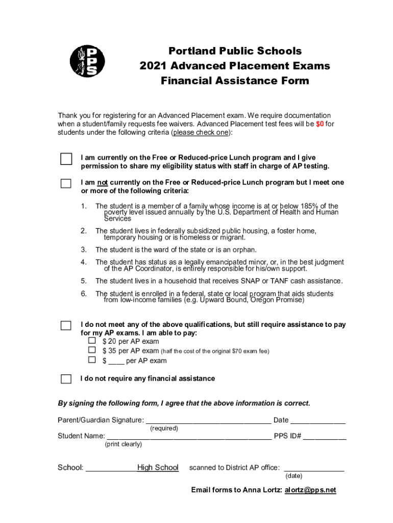 Portland Public Schools 2021 Advanced Placement Exams Financial Assistance Form Thank you for registering for an Advanced Placement exam. We require documentation when a student/family requests fee