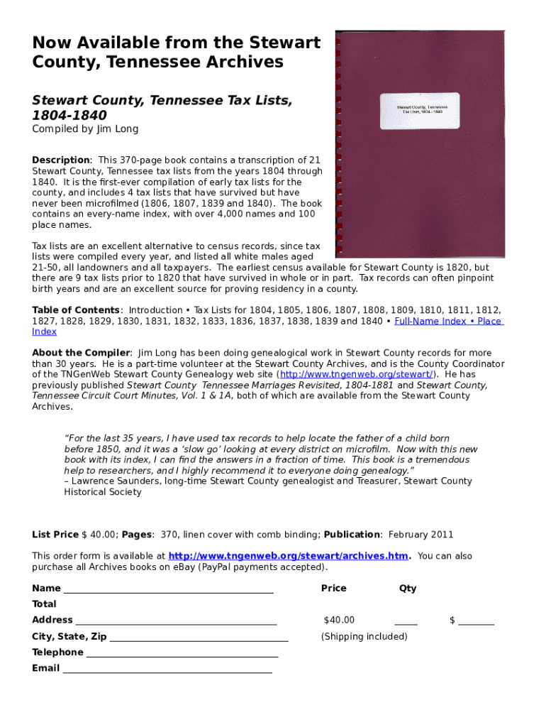What is Now Available from the Stewart County, Tennessee Archives - TNGenWeb Form?